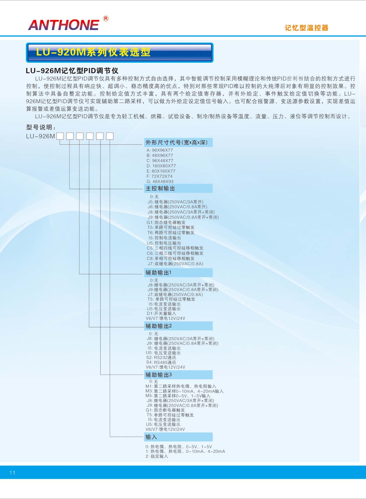 LU-926M智能調(diào)節(jié)儀是一種采用全新設(shè)計(jì)理念的高性能、高可靠性智能型工業(yè)調(diào)節(jié)儀表。專為輕工機(jī)械、烘箱、試驗(yàn)設(shè)備、制冷/制熱設(shè)備等溫度、流量、壓力、液位等調(diào)節(jié)控制而設(shè)計(jì)