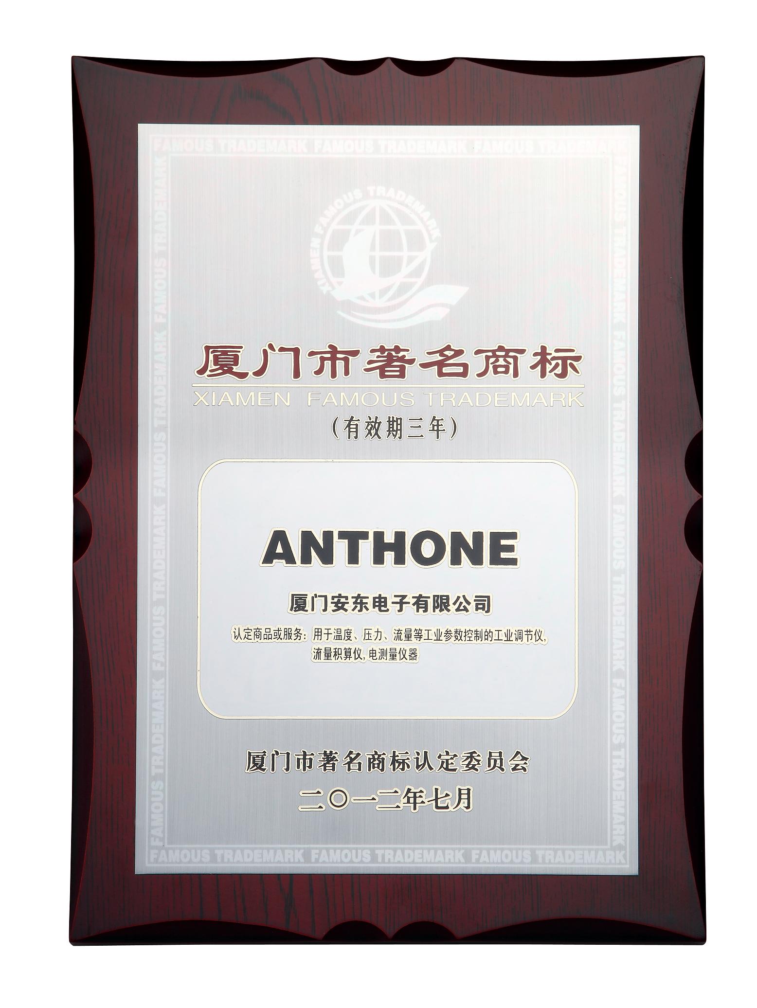 2013-01-17熱烈祝賀廈門安東電子有限公司于2012年12月19日,榮獲“廈門市著名商標”的光榮稱號及證書。經過公司及安東人不懈地努力和進取,秉著鉆于研發、精于制造、勇于開拓的企業精神,打造出優質優異的產品,公司生產的產品及提供的服務:用于溫度、壓力、流量等工業參數控制的工業調節儀,流量積算儀、電測量儀器等,通過了市著名商標認定委員會的認證審核,標志著我們的產品在業內獨領風騷,也極大地激勵我們朝著更大更遠的夢想奮斗!