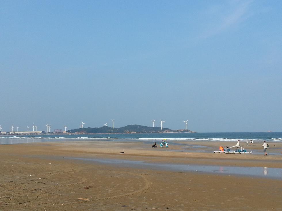 我望著成排的風車,心里也感到無比的放松和喜悅。深呼氣,含有大海淡淡的空氣撲鼻而來,映入眼簾的是一片寬廣的沙灘,一些娛樂設備整齊地擺放在沙灘上,這是個還沒有完全開發的景點,所以我們感受不到類似其他景點的濃厚的商業氣息,沒有嘈雜的聲音,沒有黑壓壓的人群,從眼前拂過的僅僅是彌漫著淡淡海水味的空氣,還有就是讓我們內心得到放松的寧靜。踩著細膩的沙子伴著一絲的波紋,心仿佛開始隨著波浪的涌動跳動著,心里再多不能解開的思緒頓時化作烏有。在這里,我們日常生活中緊張疲憊的心情得以舒緩,放開身心去親近自然,就能感受自然界神奇的創造力和頑強的生命力,那我們還有什么事放不下的呢?